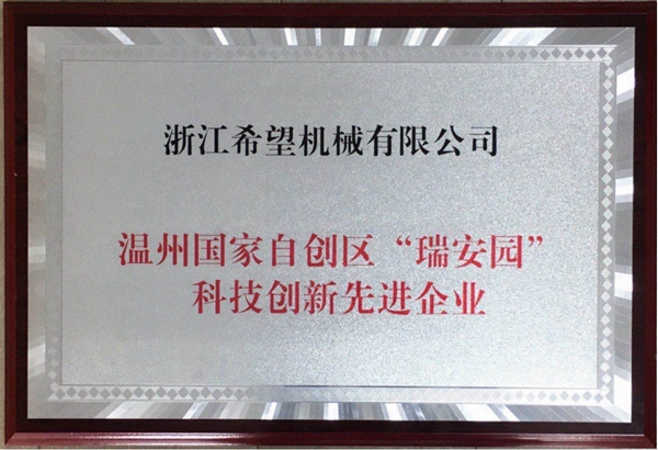 浙江希望機(jī)械有限公司榮獲溫州國家自創(chuàng)區(qū)“瑞安園”科技創(chuàng)新先進(jìn)企業(yè)