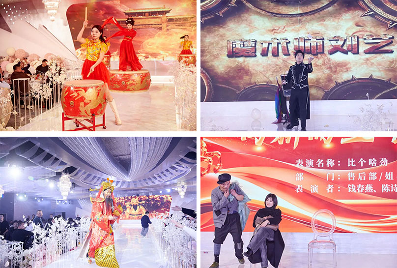 晚會節(jié)目精彩紛呈,均由公司員工自編自演,展現(xiàn)了團隊的創(chuàng)造力與凝聚力。生產(chǎn)部《三句半》、技術(shù)與銷售部聯(lián)袂演出的搞笑舞蹈《青蛙舞》、生產(chǎn)倉庫《馬年Style》等節(jié)目輪番登場。由售后部帶來的創(chuàng)意走秀《樣品奇遇記》,將公司產(chǎn)品從車間搬上舞臺,結(jié)合產(chǎn)品功能與藝術(shù)表達,呈現(xiàn)了一場別開生面的視覺盛宴,贏得現(xiàn)場陣陣掌聲。